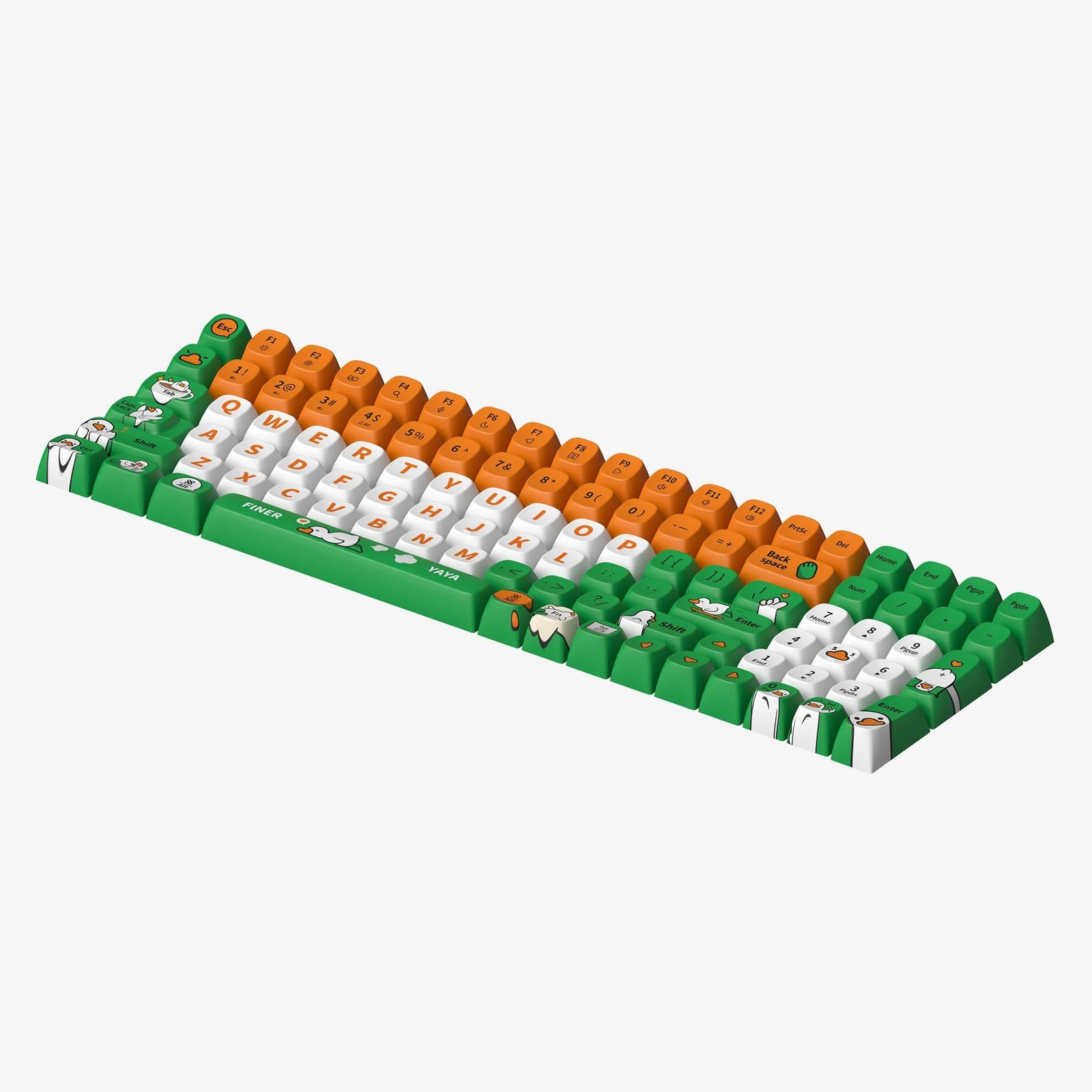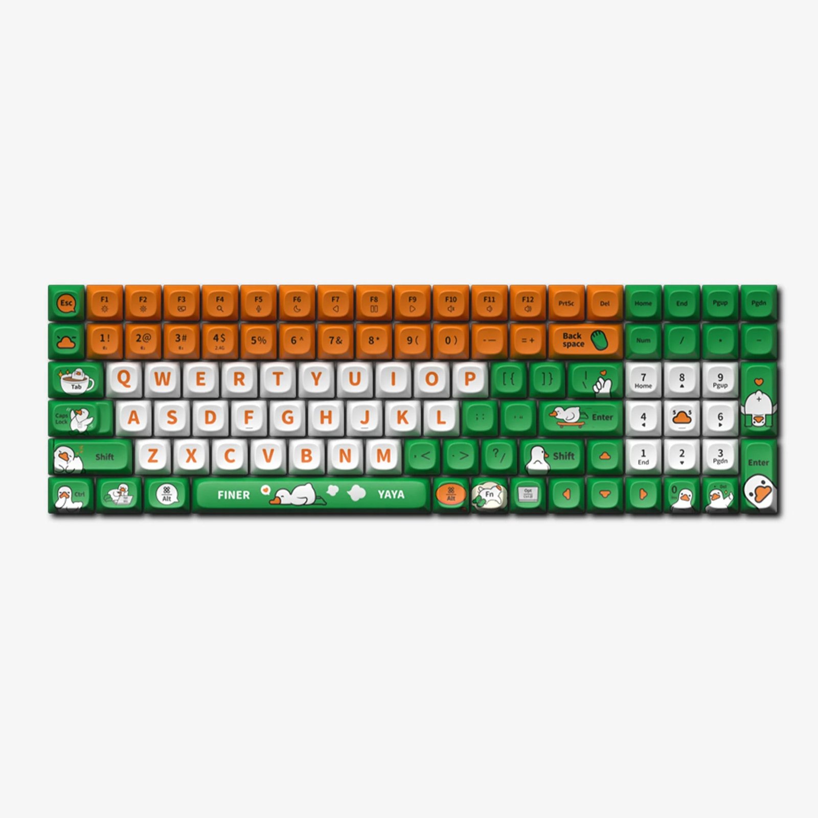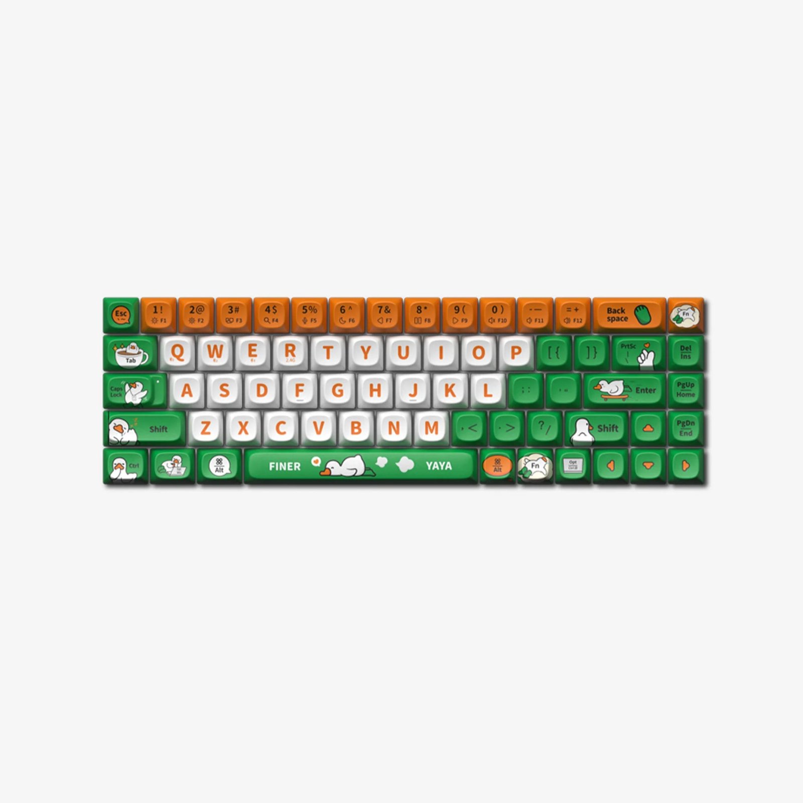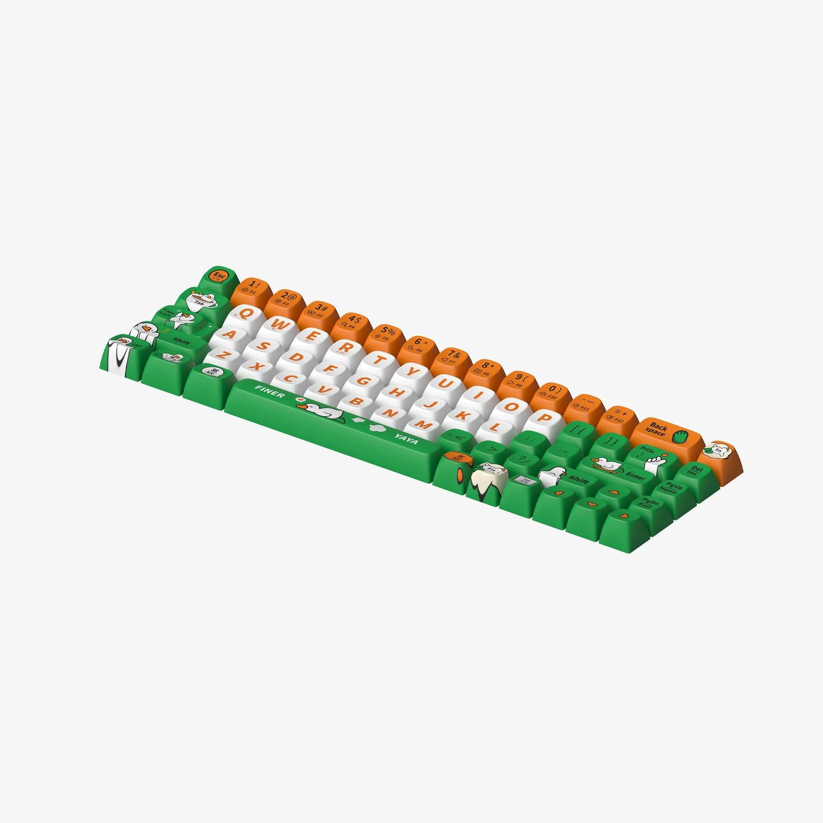 Brighten your keyboard with “Yaya Duck” keycaps, inspired by the whimsical duck from Finerworld, who is the pet of “Finner”. Known for his grumblings yet joyful life with humans, Yaya offers a playful and happy vibe to your daily interactions. Perfect for bringing a bit of joy and humor to your daily typing.