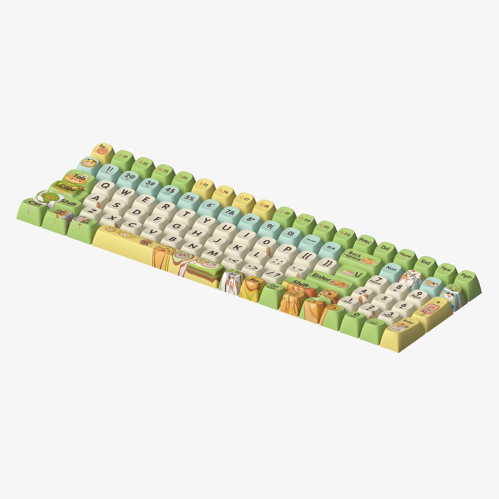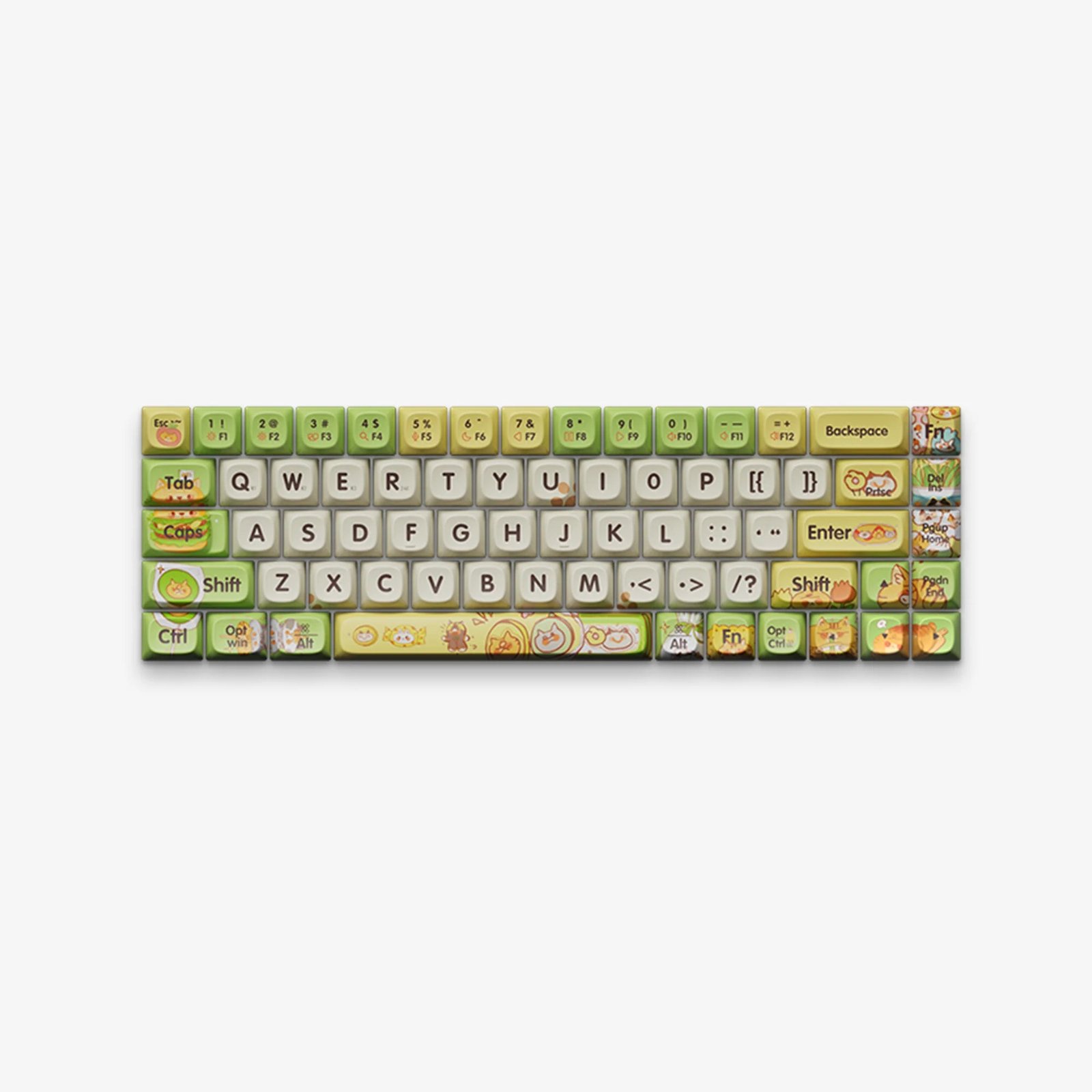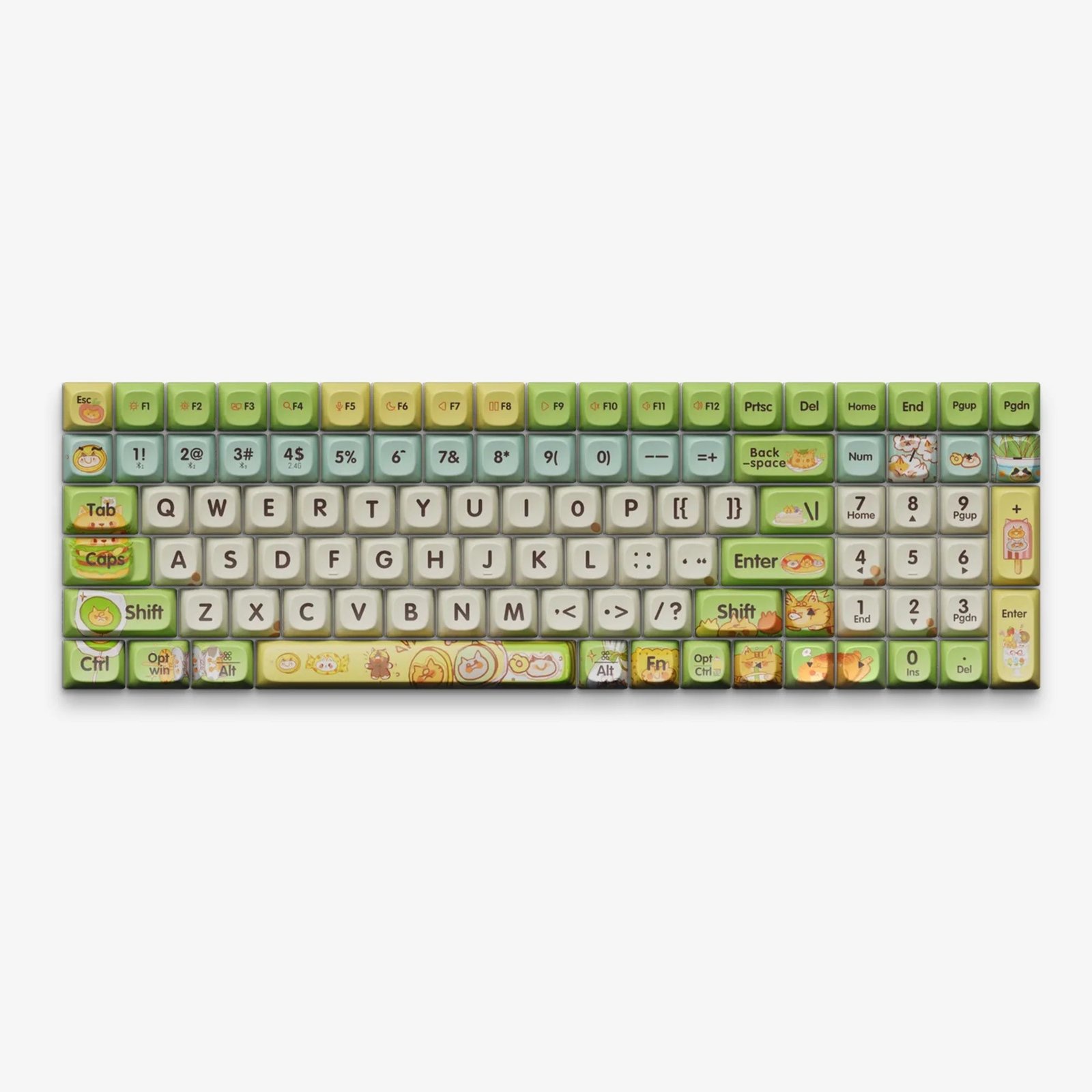 Indulge in the delightful fusion of cats and culinary food with our “Greedy Cat” keycaps. Featuring cut cats paired with favorite snacks like burgers, soda, candy, and cookies. The lively yellow and green color scheme enhances the fresh, fun vibe, making every keystroke an enjoyable and vibrant experience.